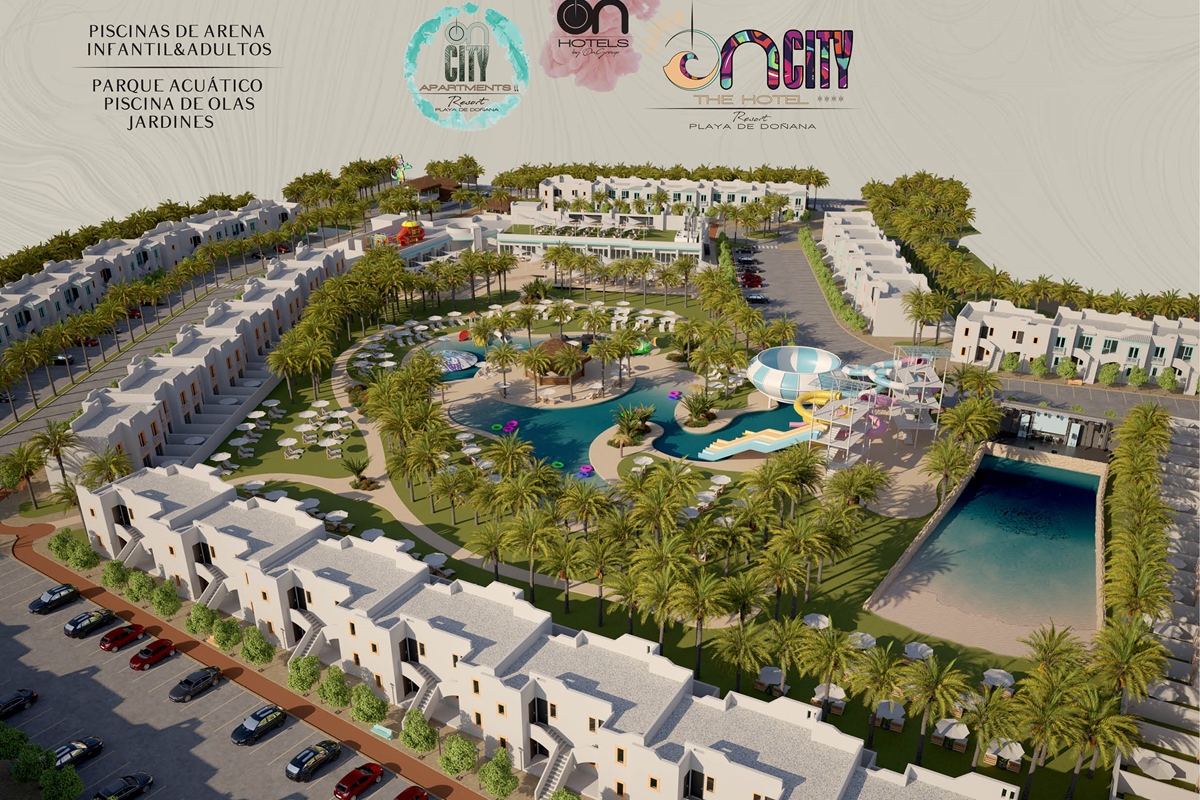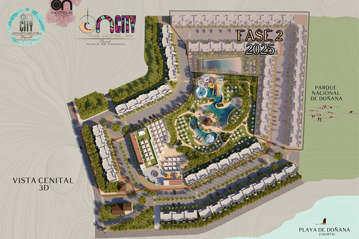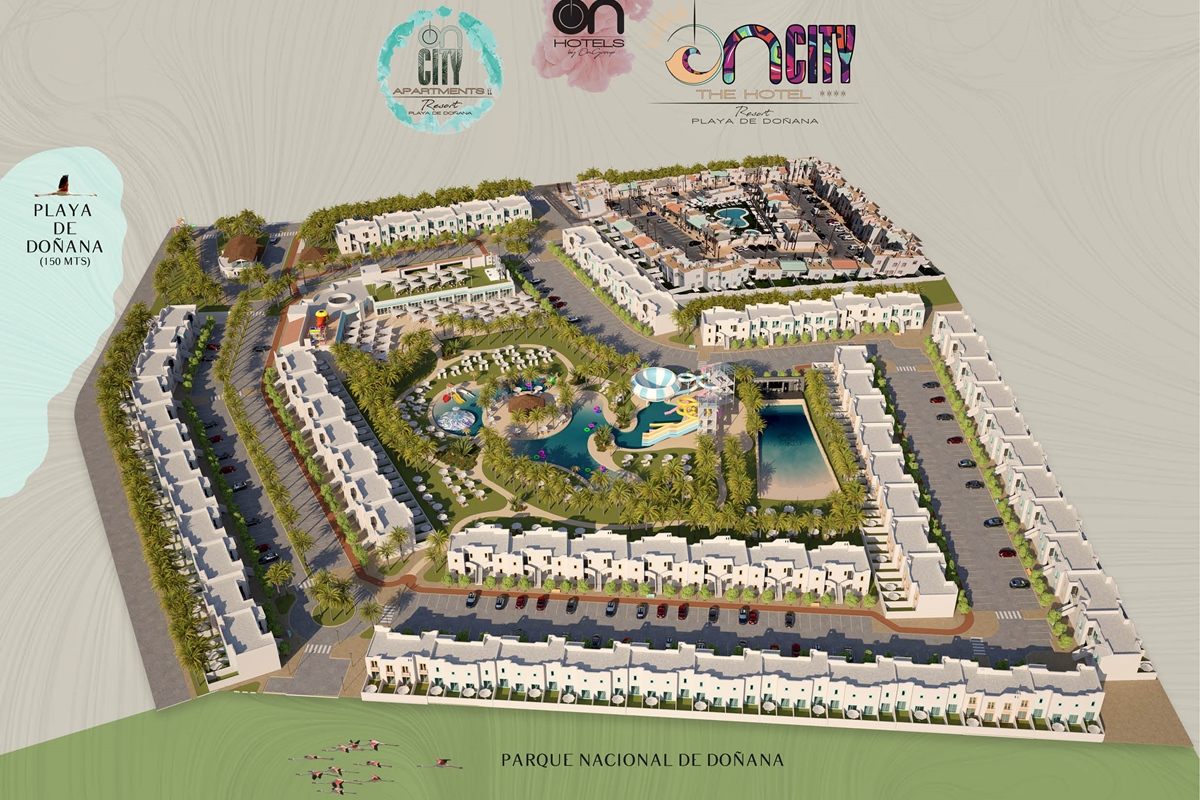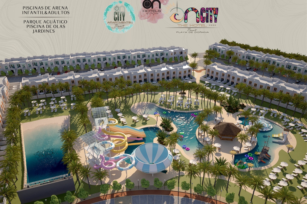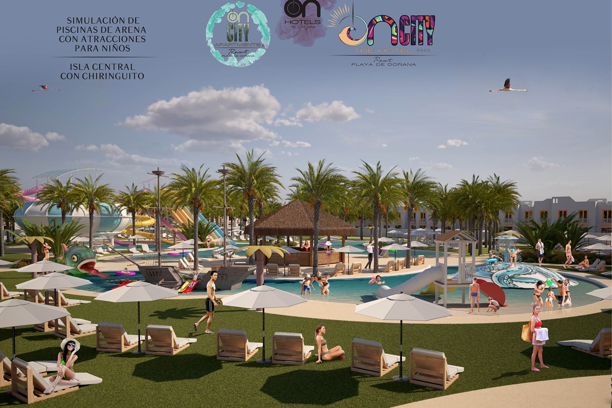 The first large Resort in the heart of Doñana Beach. The most ambitious project of ON Hotels Group, in which we seek to welcome all those who want to enjoy this natural paradise. Ideal for couples or families looking to disconnect and enjoy the South of the South . Our Resort has 2 ON CITY RESORT APARTMENTS 2LL establishments with more than 90 one, two and three bedroom apartments, pool area and food truck for snacks and drinks, and ON CITY RESORT THE HOTEL**** that opens its doors in June 2024 with 568 rooms, doubles, triples and quadruples, equipped with everything necessary to make your vacation unforgettable. The hotel has a unique water park on the Costa de la Luz where both children and adults will enjoy its facilities, with a pool bar, buffet restaurant, a leisure area with an extensive entertainment program, live music, Camaleón kids club, and Drink & Shop ONE1. We are located 350 meters from La Playa, with for your comfort and transportation a Camaleón tourist train throughout the day, which will communicate with the beach area where ON CITY BEACH CLUB is located.