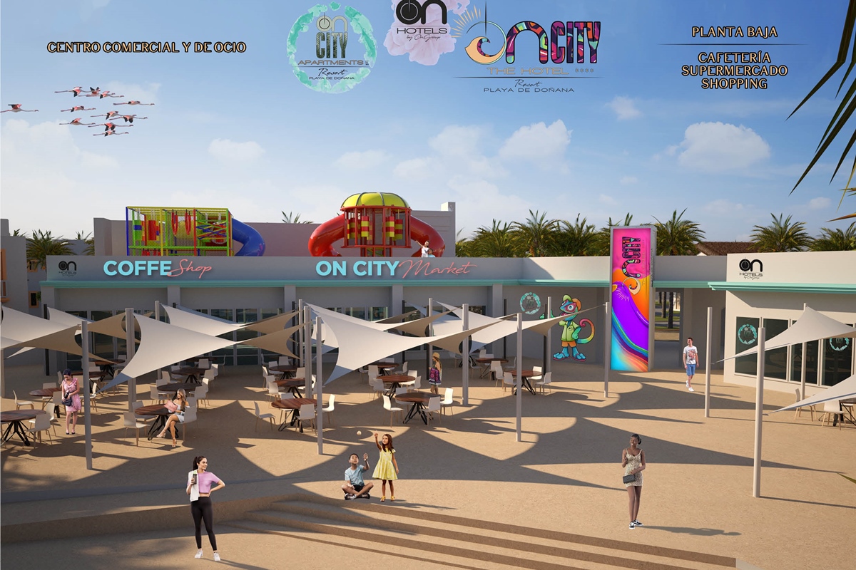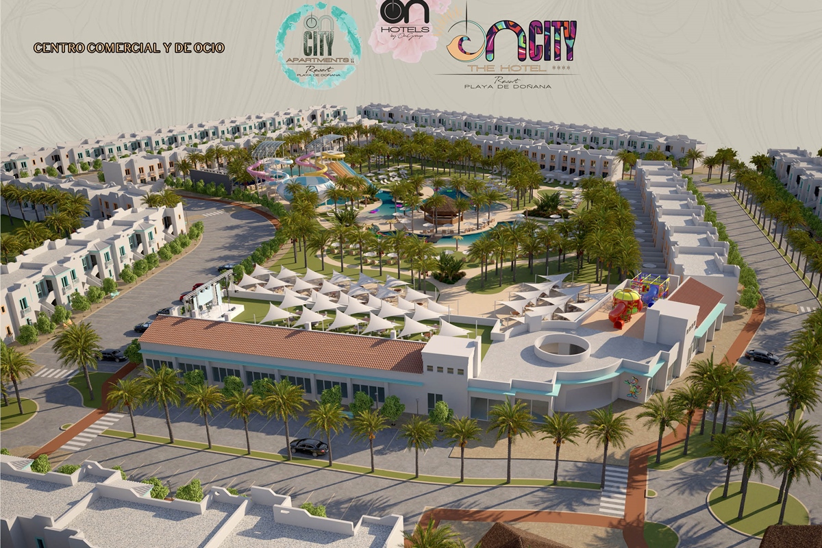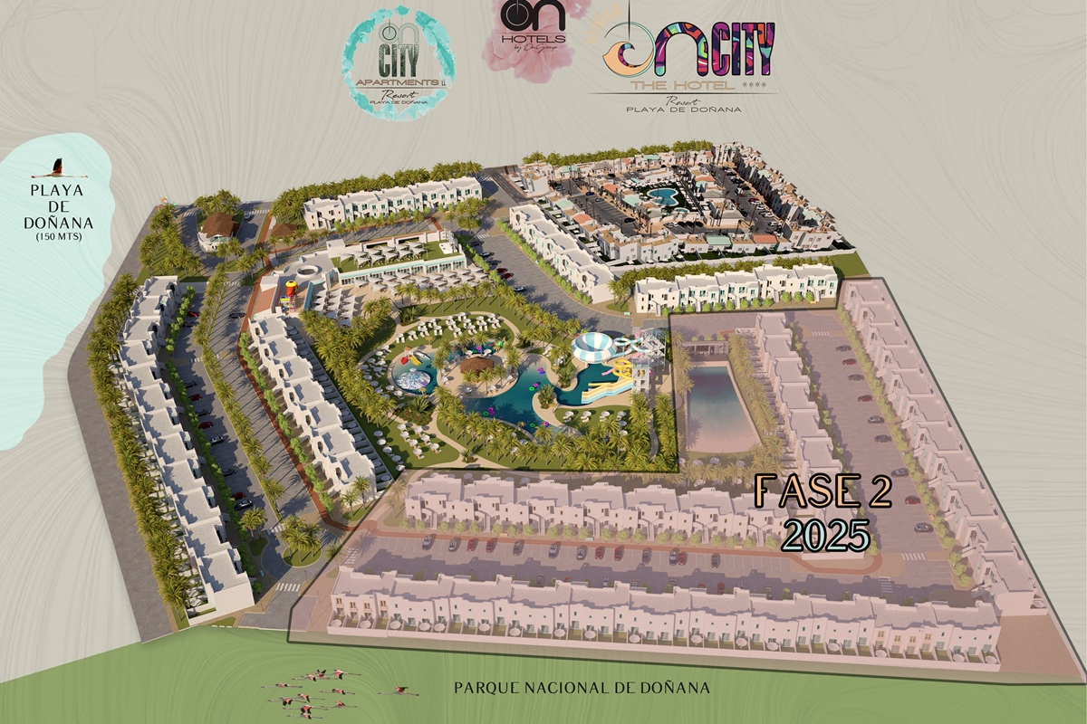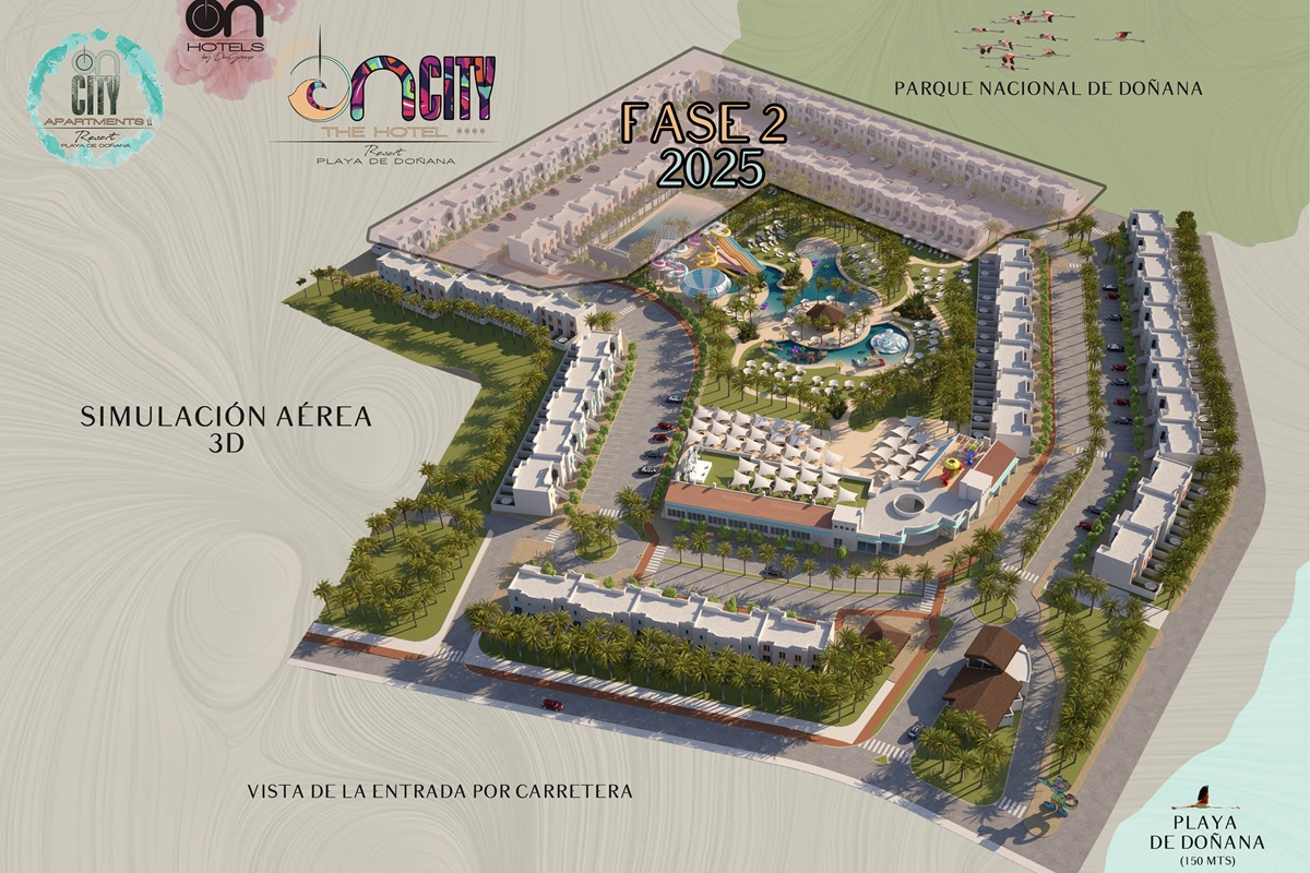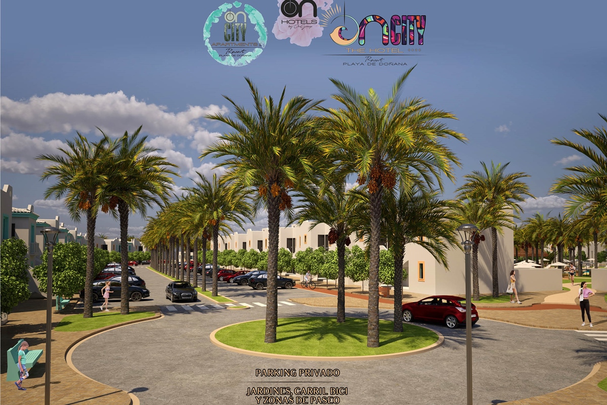 The first large Resort in the heart of Doñana Beach. The most ambitious project of ON Hotels Group, in which we seek to welcome all those who want to enjoy this natural paradise. Ideal for couples or families looking to disconnect and enjoy the South of the South . Our Resort has 2 ON CITY RESORT APARTMENTS 2LL establishments with more than 90 one, two and three bedroom apartments, pool area and food truck for snacks and drinks, and ON CITY RESORT THE HOTEL**** that opens its doors in June 2024 with 568 rooms, doubles, triples and quadruples, equipped with everything necessary to make your vacation unforgettable. The hotel has a unique water park on the Costa de la Luz where both children and adults will enjoy its facilities, with a pool bar, buffet restaurant, a leisure area with an extensive entertainment program, live music, Camaleón kids club, and Drink & Shop ONE1. We are located 350 meters from La Playa, with for your comfort and transportation a Camaleón tourist train throughout the day, which will communicate with the beach area where ON CITY BEACH CLUB is located.
