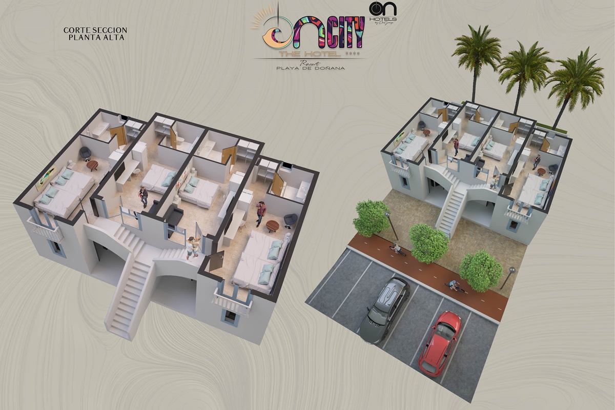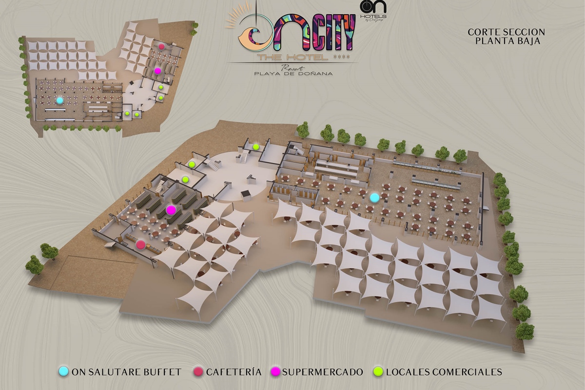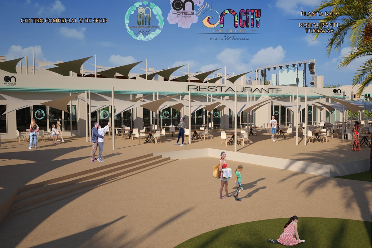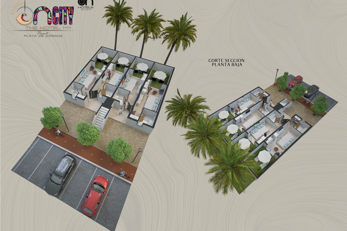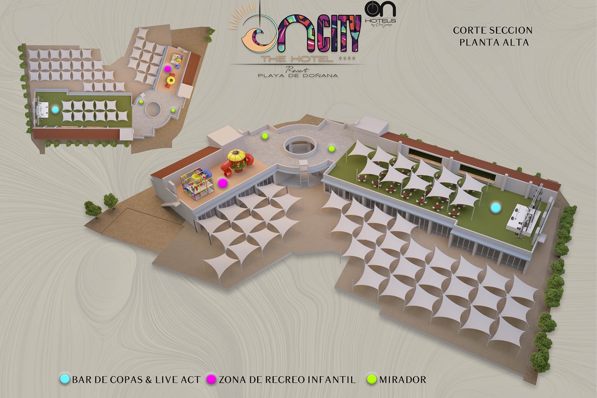The first large Resort in the heart of Doñana Beach. The most ambitious project of ON Hotels Group, in which we seek to welcome all those who want to enjoy this natural paradise. Ideal for couples or families looking to disconnect and enjoy the South of the South . Our Resort has 2 ON CITY RESORT APARTMENTS 2LL establishments with more than 90 one, two and three bedroom apartments, pool area and food truck for snacks and drinks, and ON CITY RESORT THE HOTEL**** that opens its doors in June 2024 with 568 rooms, doubles, triples and quadruples, equipped with everything necessary to make your vacation unforgettable. The hotel has a unique water park on the Costa de la Luz where both children and adults will enjoy its facilities, with a pool bar, buffet restaurant, a leisure area with an extensive entertainment program, live music, Camaleón kids club, and Drink & Shop ONE1. We are located 350 meters from La Playa, with for your comfort and transportation a Camaleón tourist train throughout the day, which will communicate with the beach area where ON CITY BEACH CLUB is located.