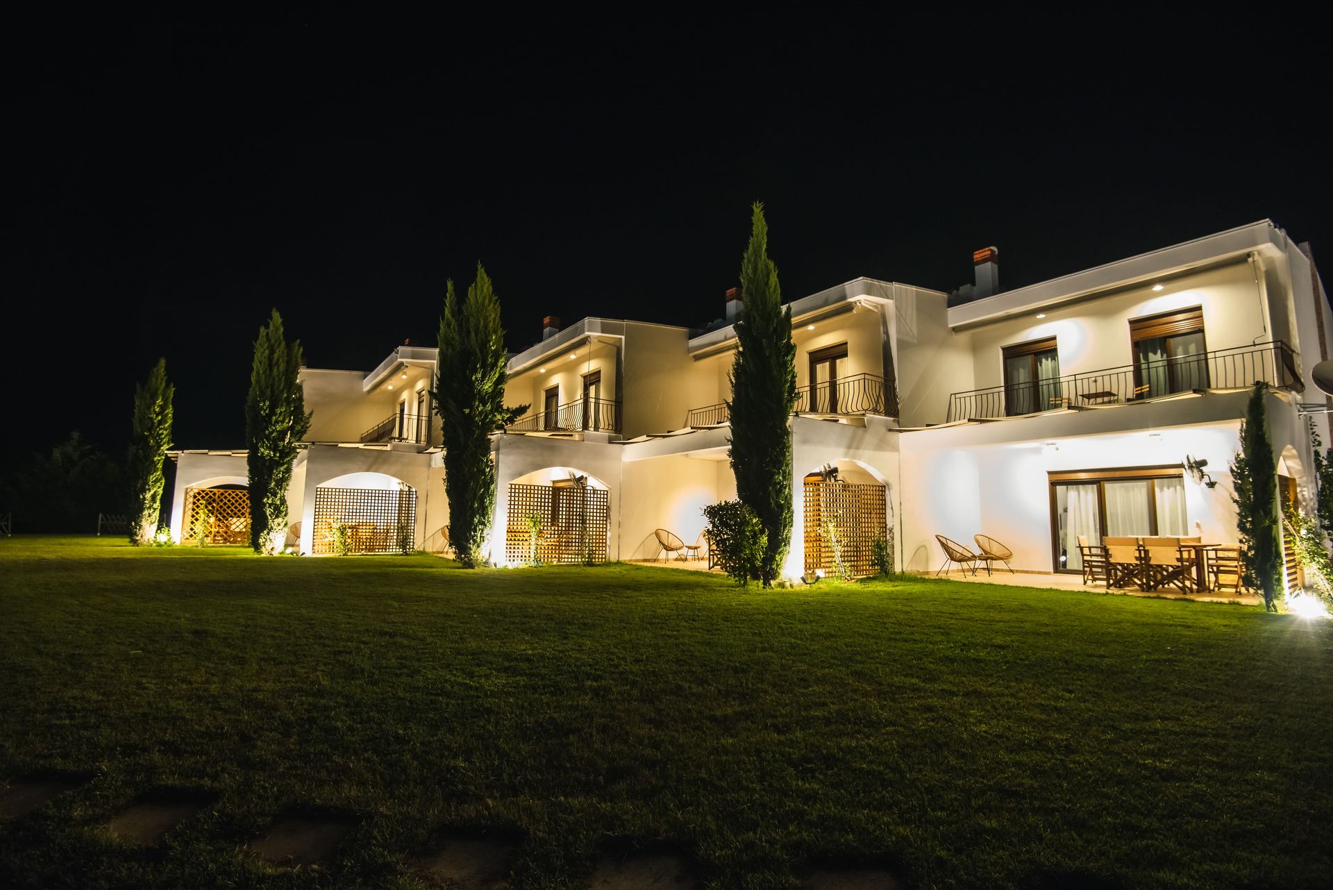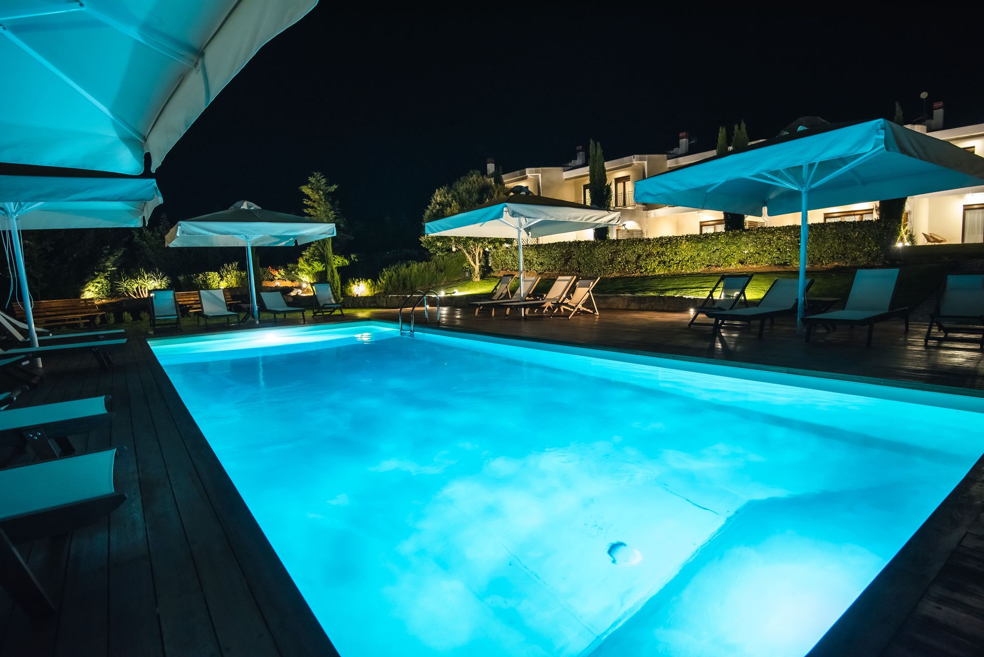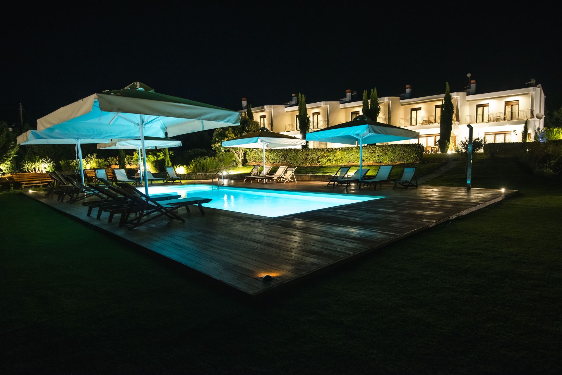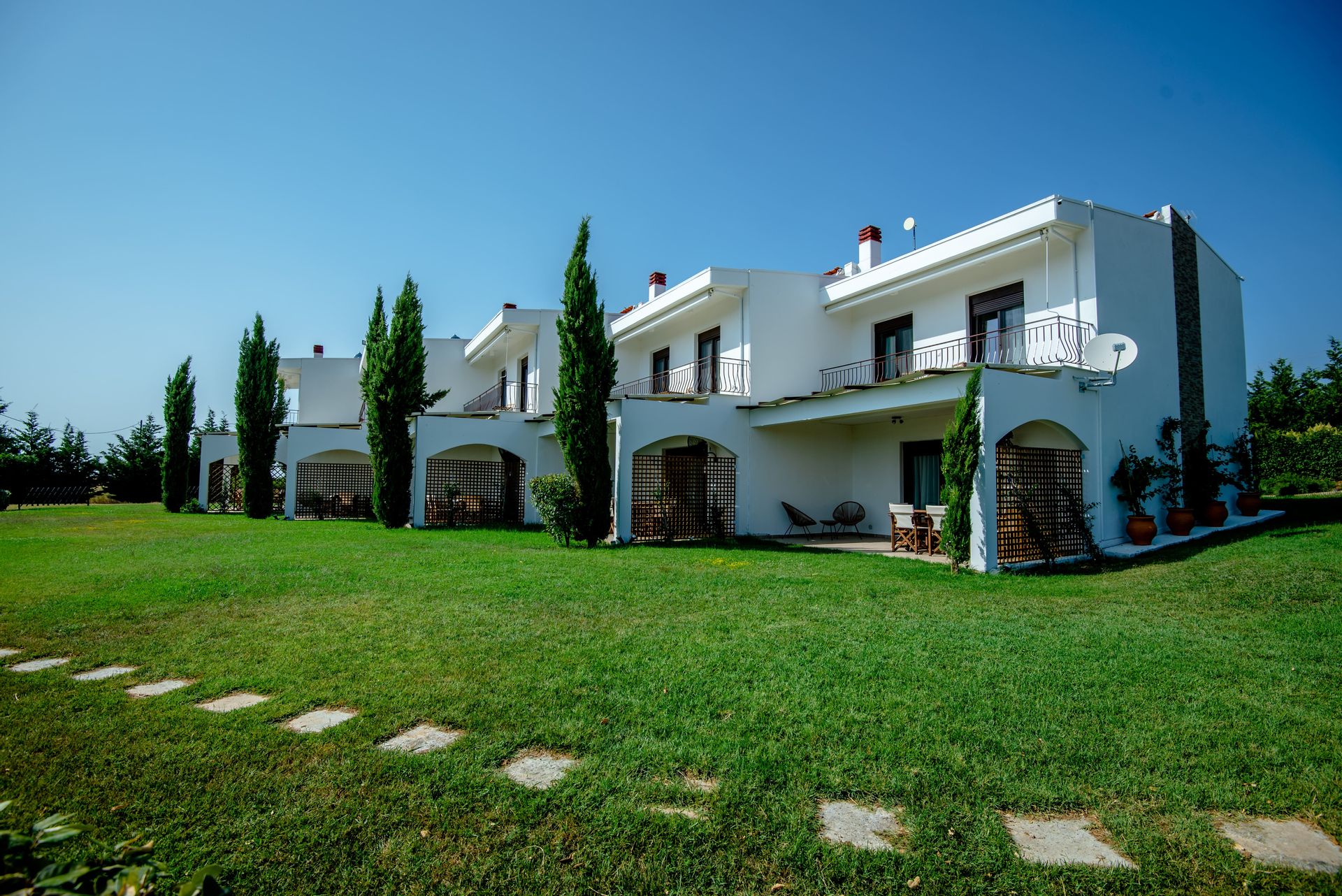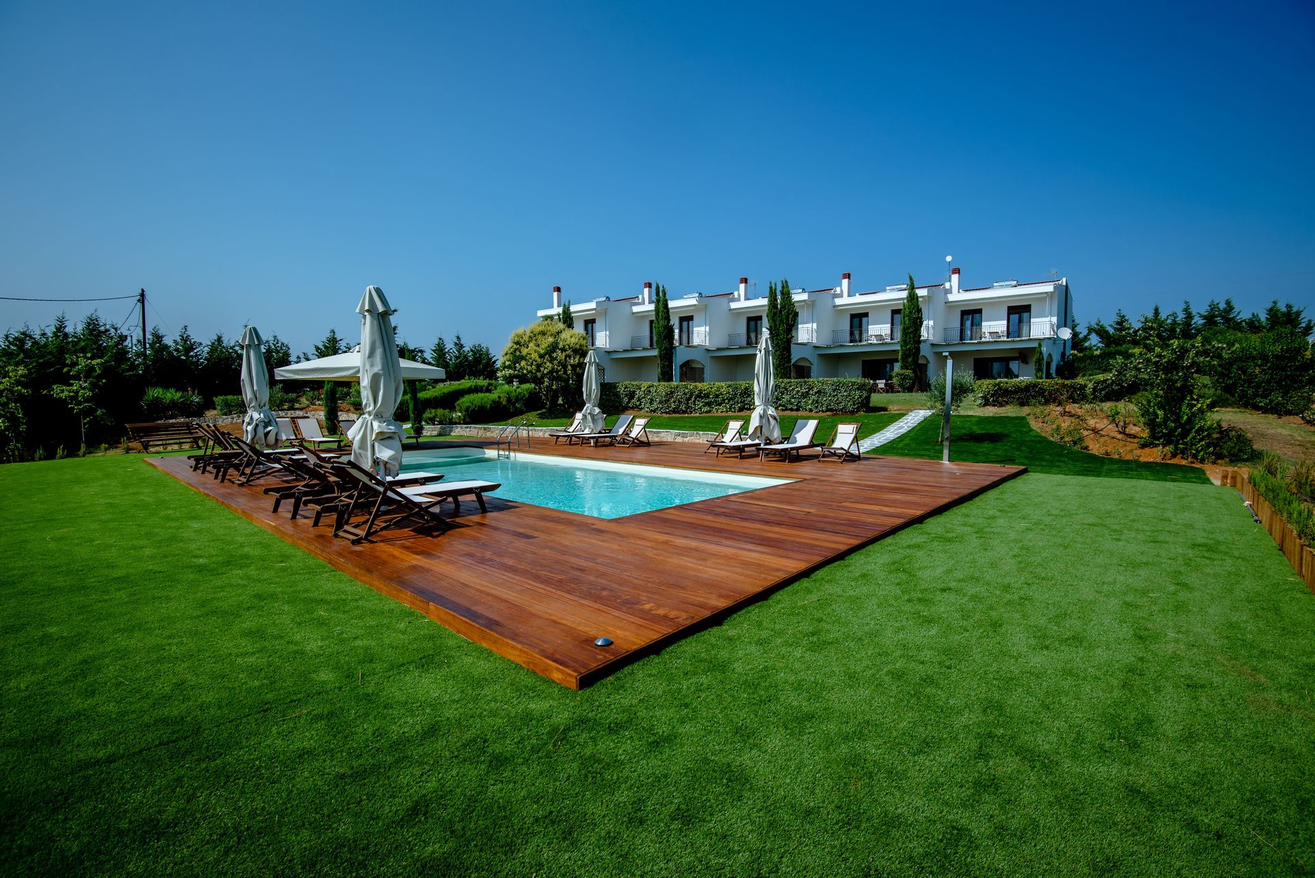 The complex consists of five 80sqm villas, with pool, garden, and parking. Each Villa hosts up to 7 persons and is separated into two floors, offering privacy and company moments at the same time.