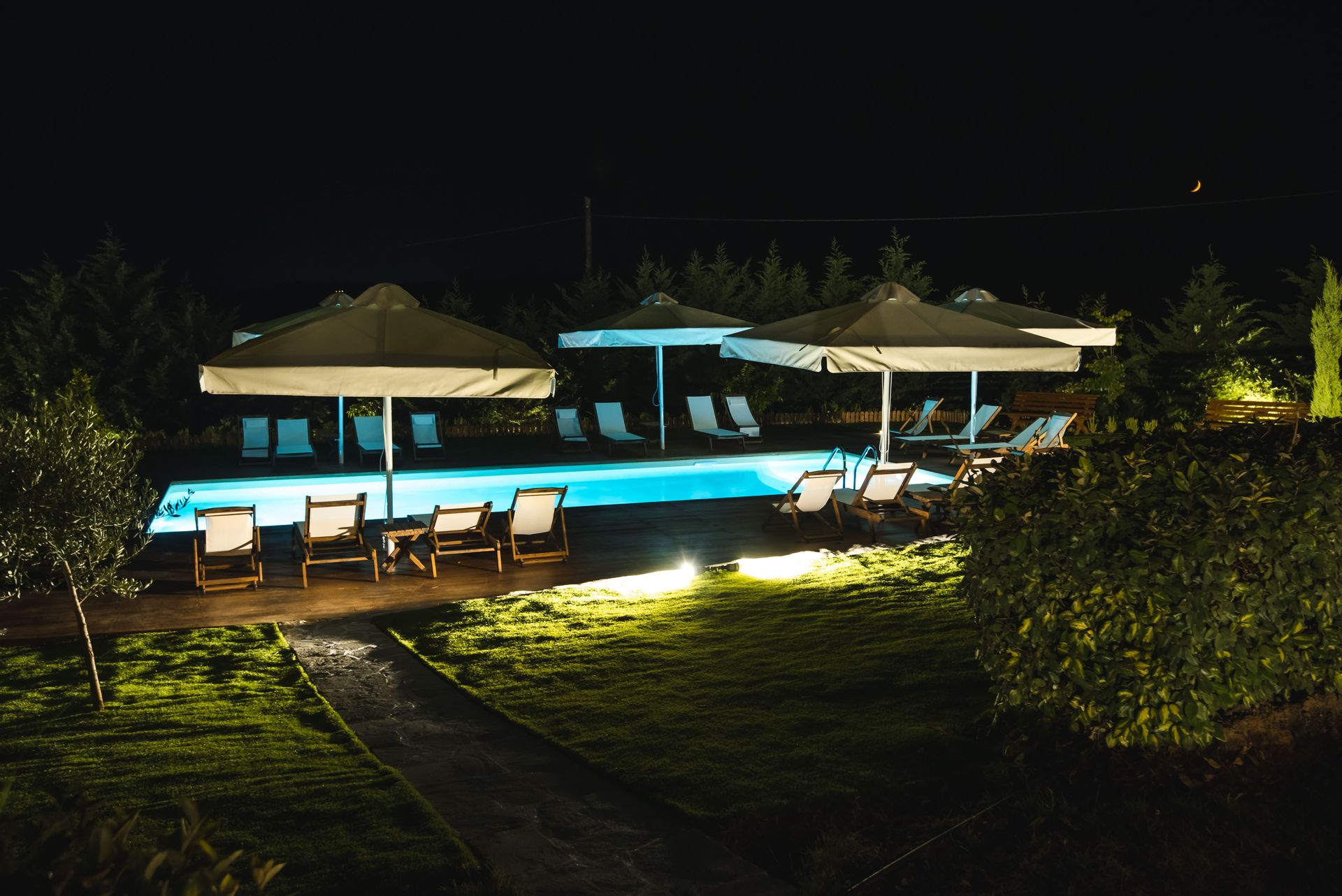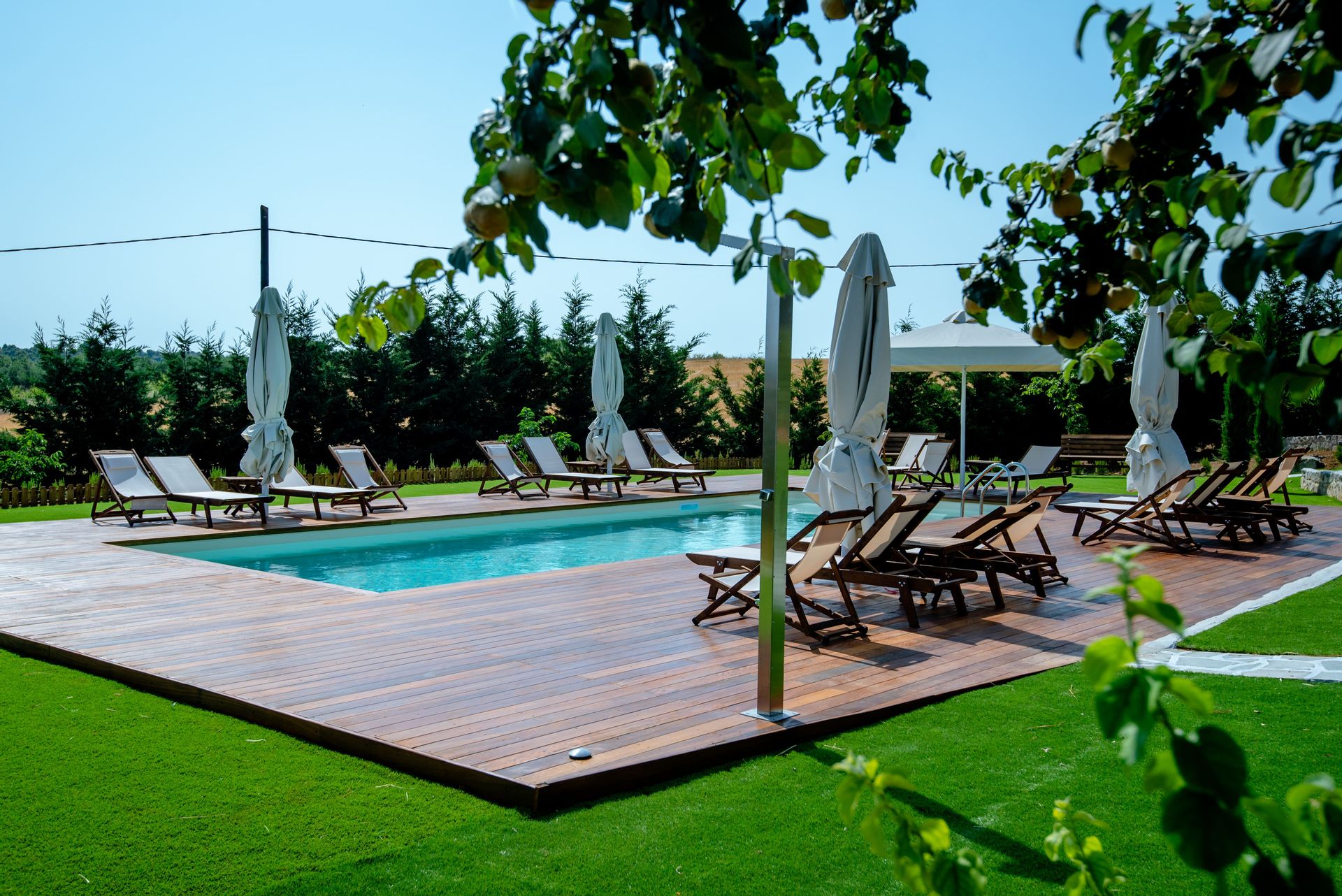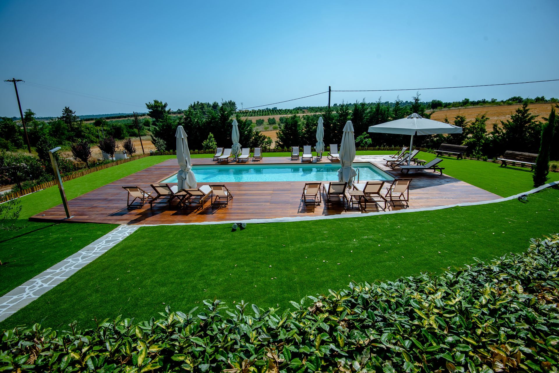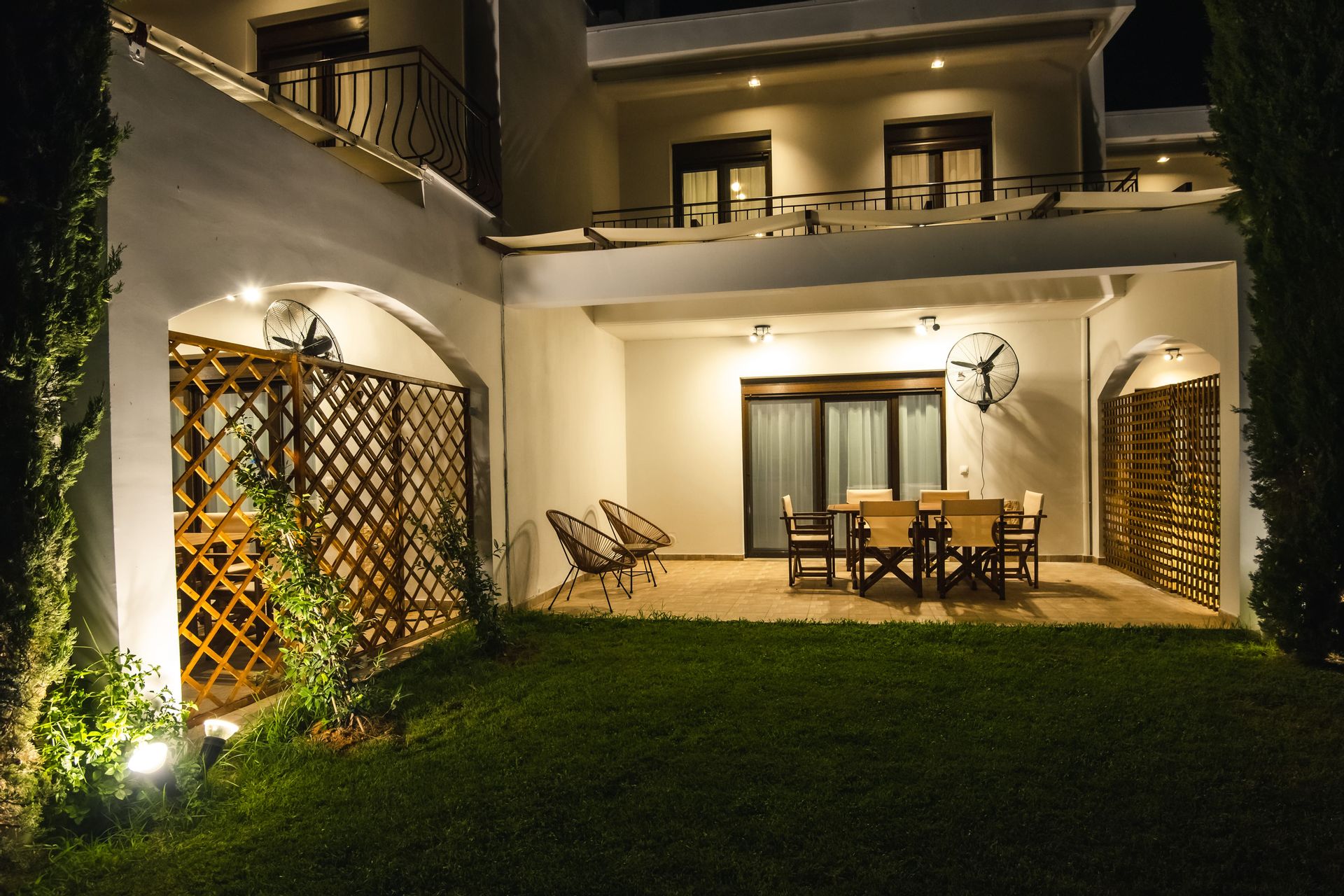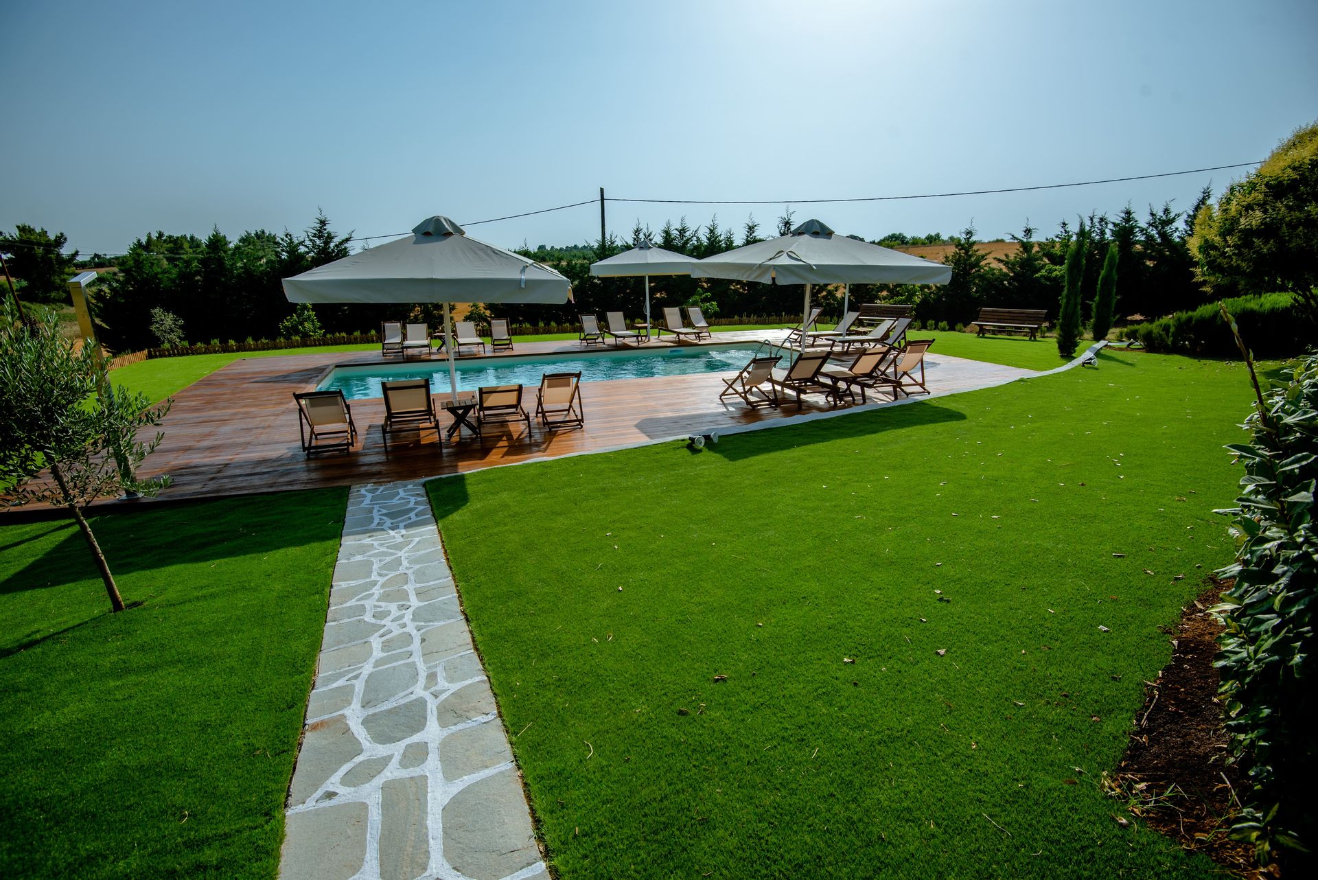 The complex consists of five 80sqm villas, with pool, garden, and parking. Each Villa hosts up to 7 persons and is separated into two floors, offering privacy and company moments at the same time.