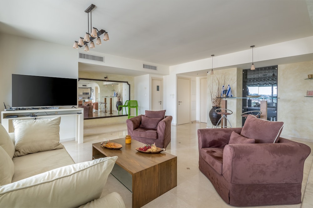 Huoneisto sijaitsee lähellä rantaa, ja Dabuchin ranta sijaitsee 4 minuutin kävelymatkan päässä ja Herzliyan satama 6 minuutin kävelymatkan päässä majoituspaikasta. Tämä huoneisto sijaitsee 1,1 km:n päässä kohteesta Eitanin ranta ja 2,1 km:n päässä kohteesta HaSharonin ranta. Tämä huoneisto tarjoaa käyttöösi keittiön, jossa on täysikokoinen jääkaappipakastin ja uuni. Huoneessa on kalustettu parveke. Huoneessa on taulutelevisio sekä satelliittikanavat, ja ilmainen langaton internetyhteys pitää sinut yhteydessä. Omassa kylpyhuoneessa on erillinen kylpyamme ja suihku ja syvä kylpyamme. Etäisyydet pyöristetään lähimpään 0,1 mailiin ja kilometriin.
