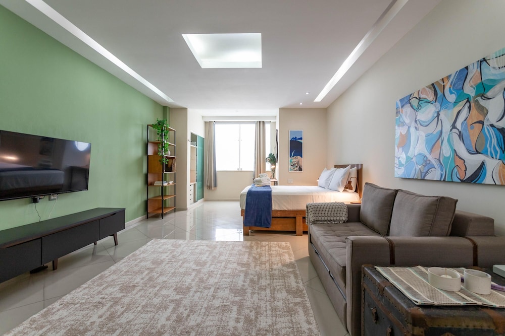 Atlântica-puistokatu sijaitsee kivenheiton päässä ja Copacabanan ranta puolestaan 3 minuutin kävelymatkan päässä. Tämä huoneisto sijaitsee 4,1 km:n päässä kohteesta Ipaneman ranta ja 13 km:n päässä kohteesta Rio de Janeiron Kristus-patsas. Tee olosi kotoisaksi huoneistossasi. Etäisyydet pyöristetään lähimpään 0,1 mailiin ja kilometriin.