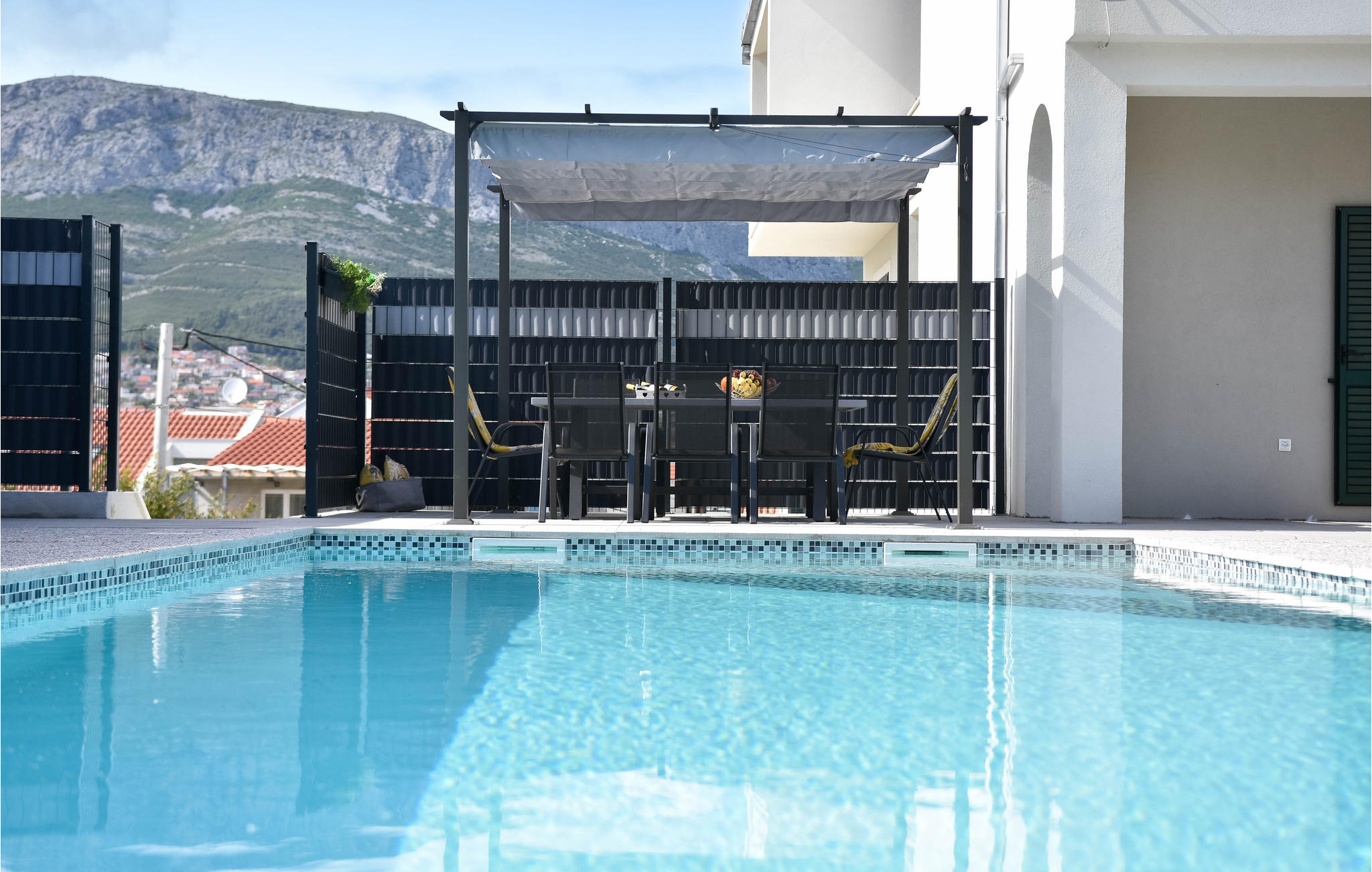Spacious and welcoming vacation home near Split.Welcome to this vacation home, which offers plenty of space for one or two families or several couples. The house is distributed over several floors and spreads over 4 bedrooms, 2 bathrooms, a living room with kitchen and a separate toilet. All bedrooms are equipped with double beds, so you are guaranteed a good night's sleep.The most beautiful place of the house is the pool area with sun loungers, where you can spend many hours swimming or lying in the sun. Thanks to the many outdoor areas with terraces and balconies, you will always find a place in the sun. Entertainment for the children is provided with a playhouse and toys.The surrounding area invites you to take long walks on marked trails, play tennis or visit the beach. The exciting city of Split is only a short drive away.- Free parking on site- Pool open: medio May-end Sept.- Private outdoor swimming pool (36m2)- Consumption costs incl.- Air conditioning- Bedlinen incl towels (included)- Final cleaning (included)- Cot: 1- Child's chair: 1Spacious and welcoming vacation home near Split.